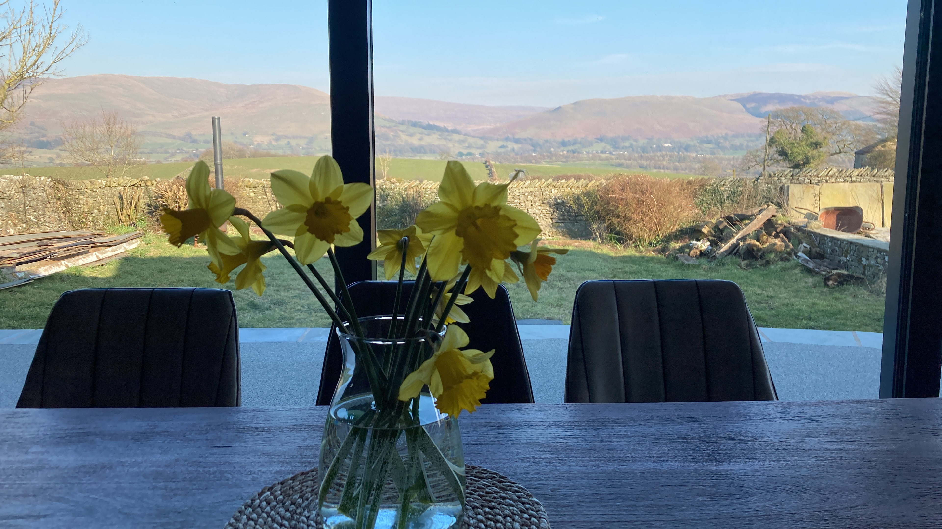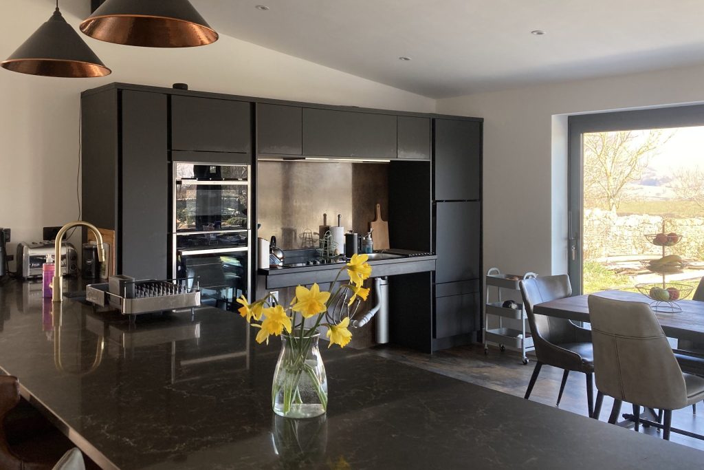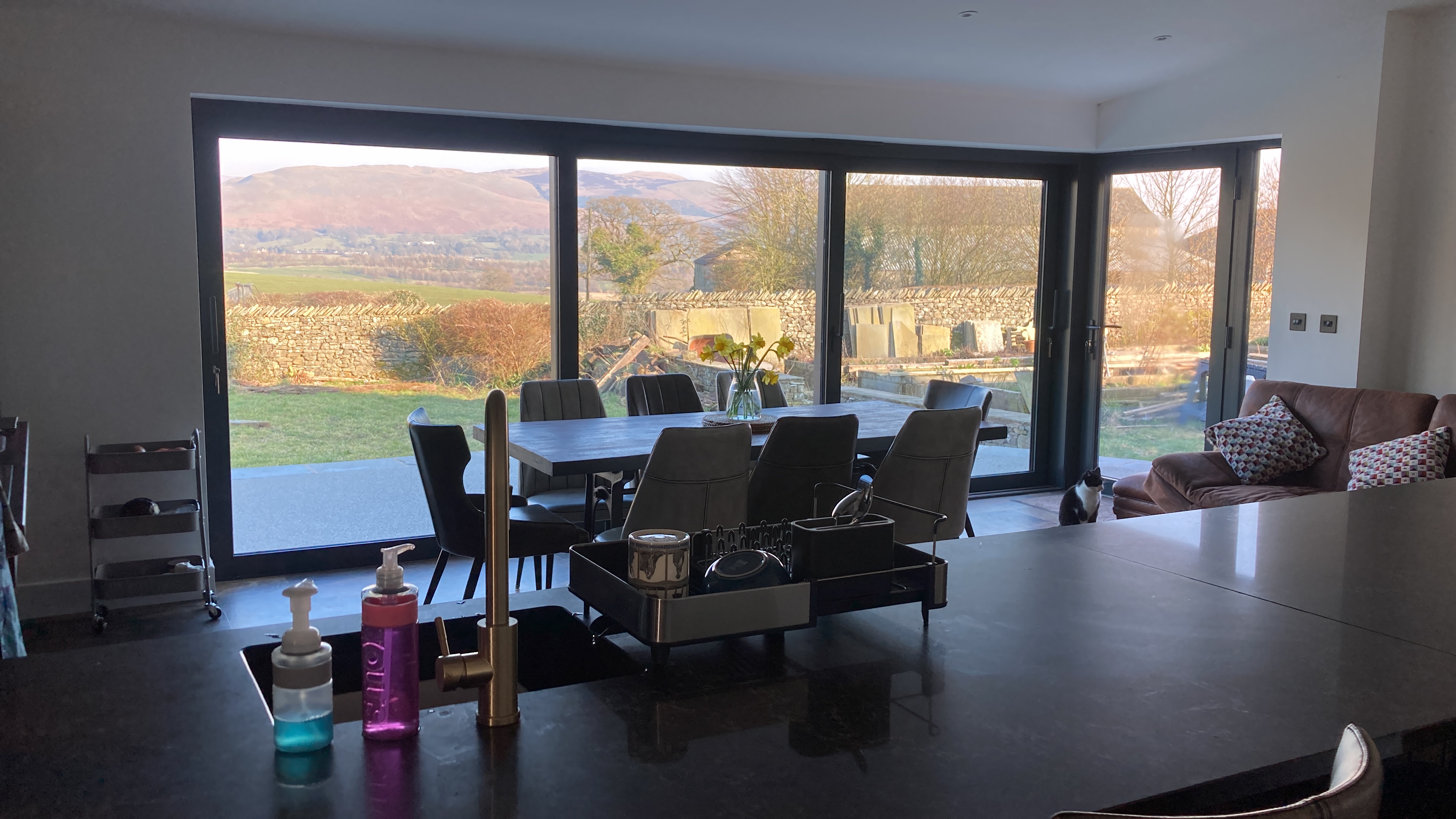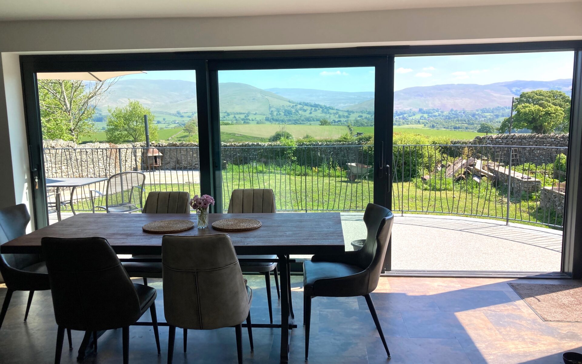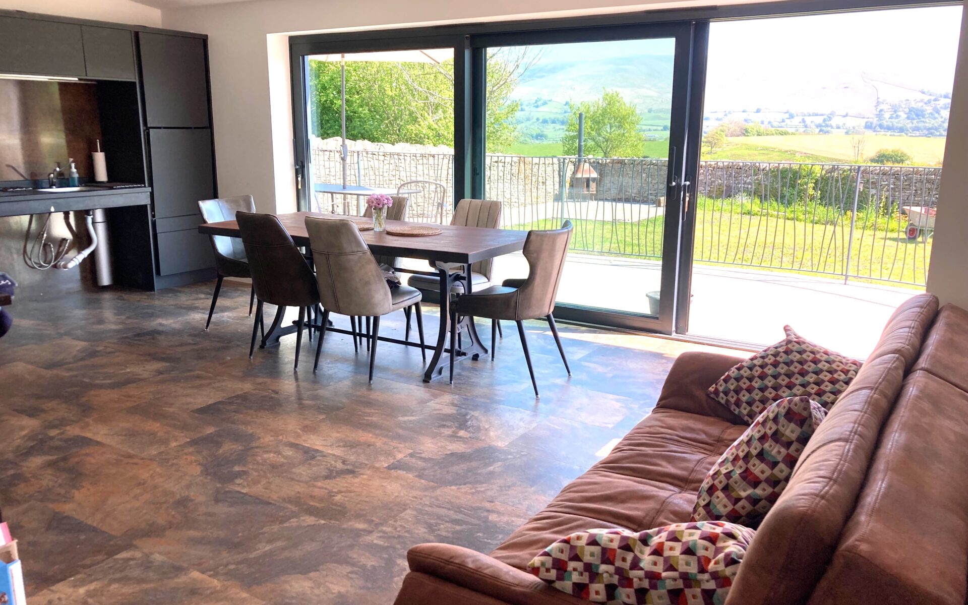 Level entrance into open plan Kitchen/Diner. Dining table seating for up to six guests, with slide and glide electric oven, microwave, and adjustable height worktop with induction hob and kitchen sink. There is also a dishwasher, fridge, freezer, wall mounted smart tv, trifold doors opening out onto patio area, and far reaching views of the local Dales.