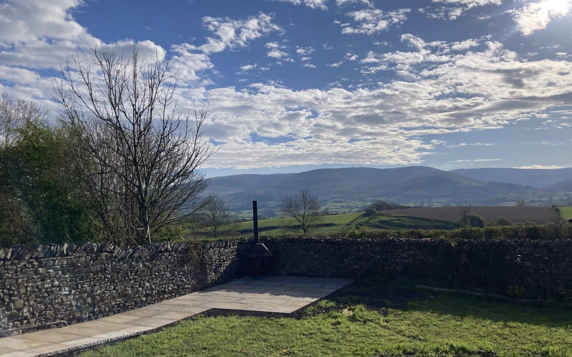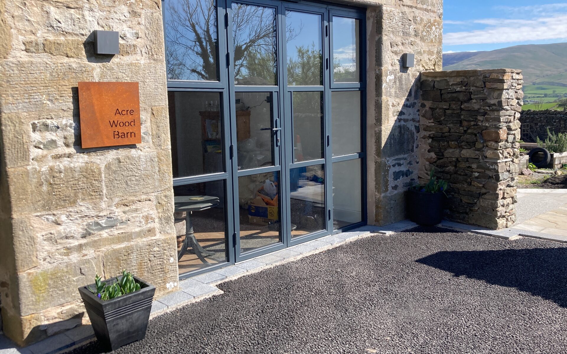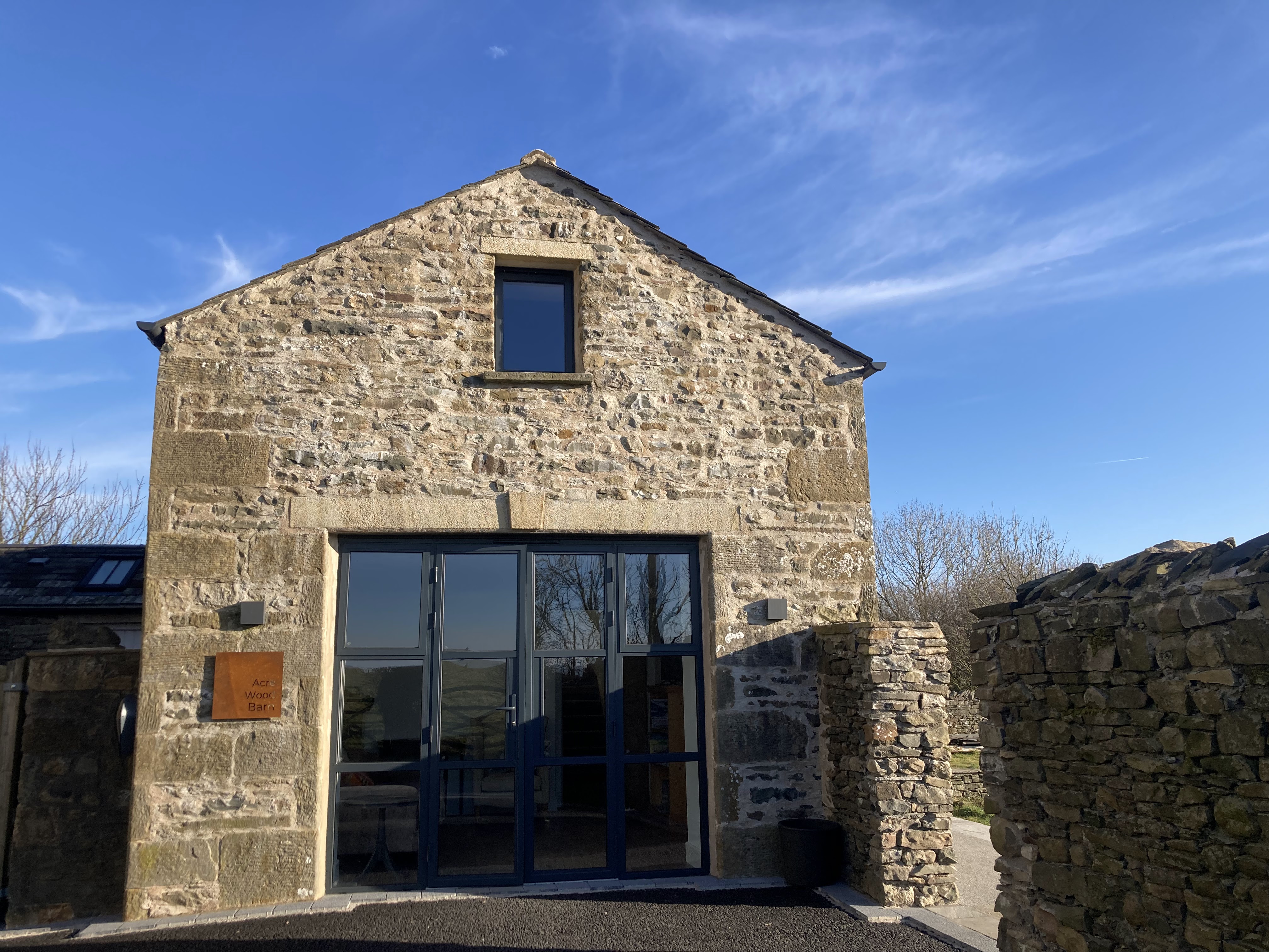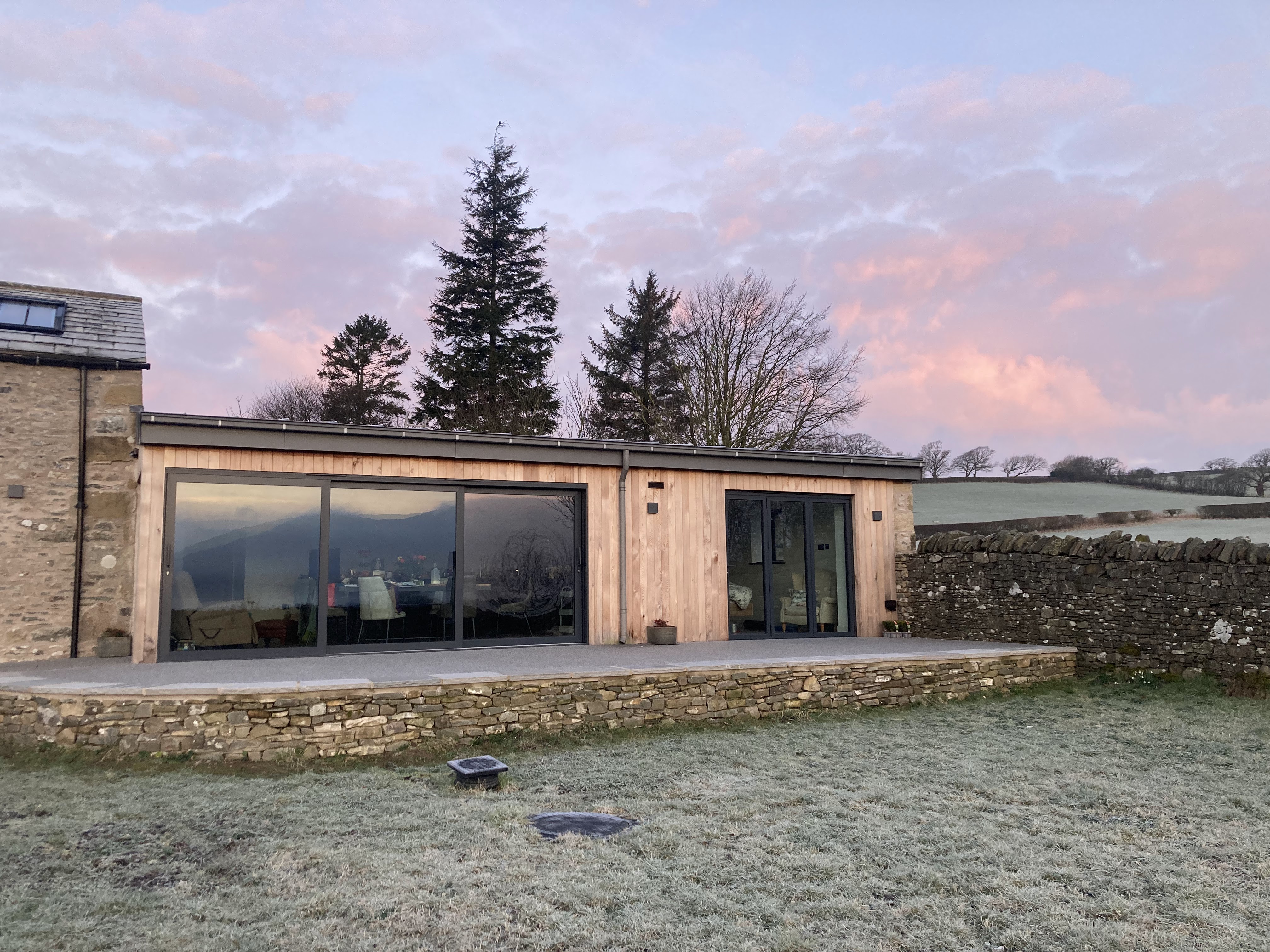 Level entrance into open plan Kitchen/Diner. Dining table seating for up to six guests, with slide and glide electric oven, microwave, and adjustable height worktop with induction hob and kitchen sink. There is also a dishwasher, fridge, freezer, wall mounted smart tv, trifold doors opening out onto patio area, and far reaching views of the local Dales.