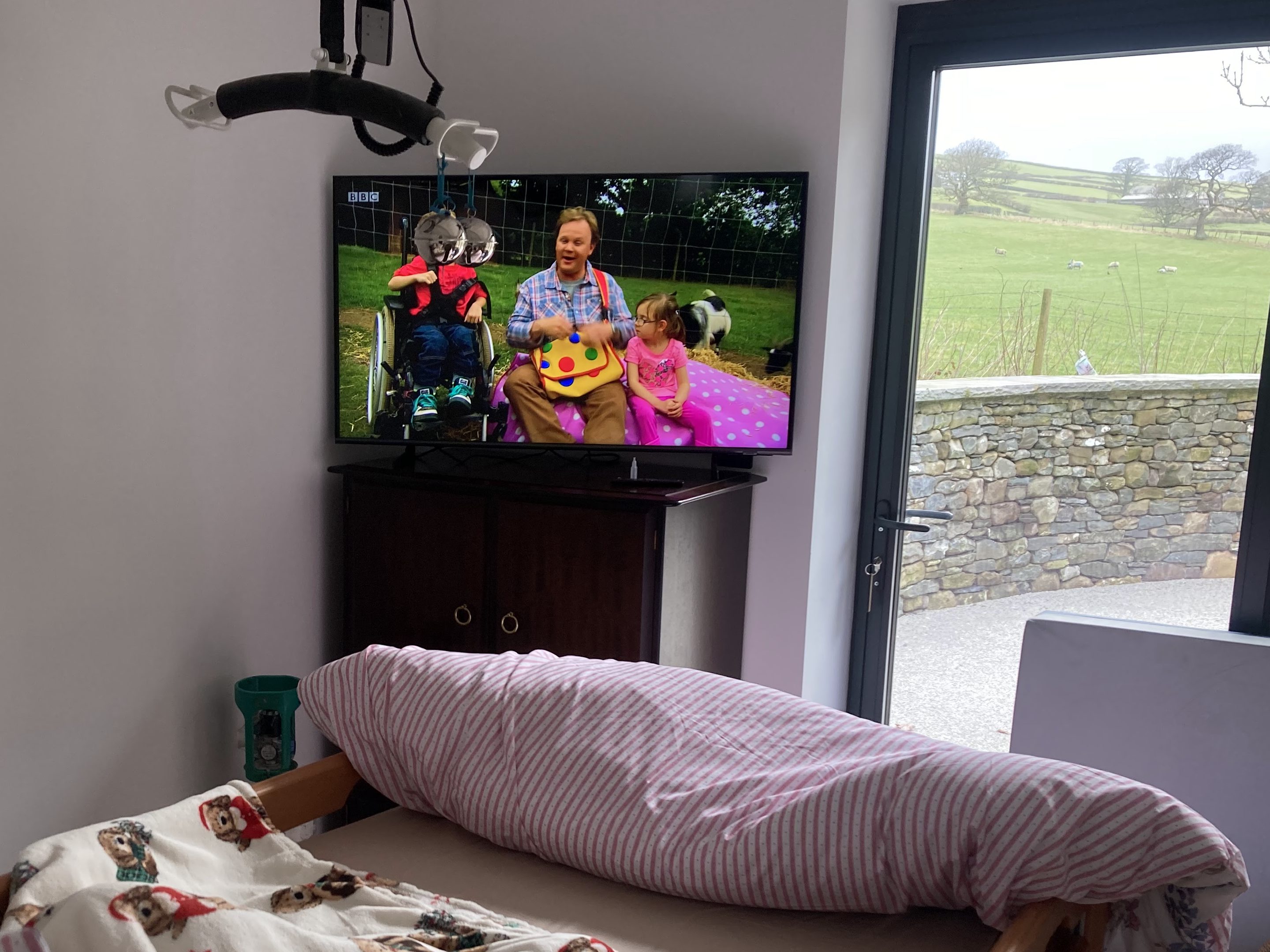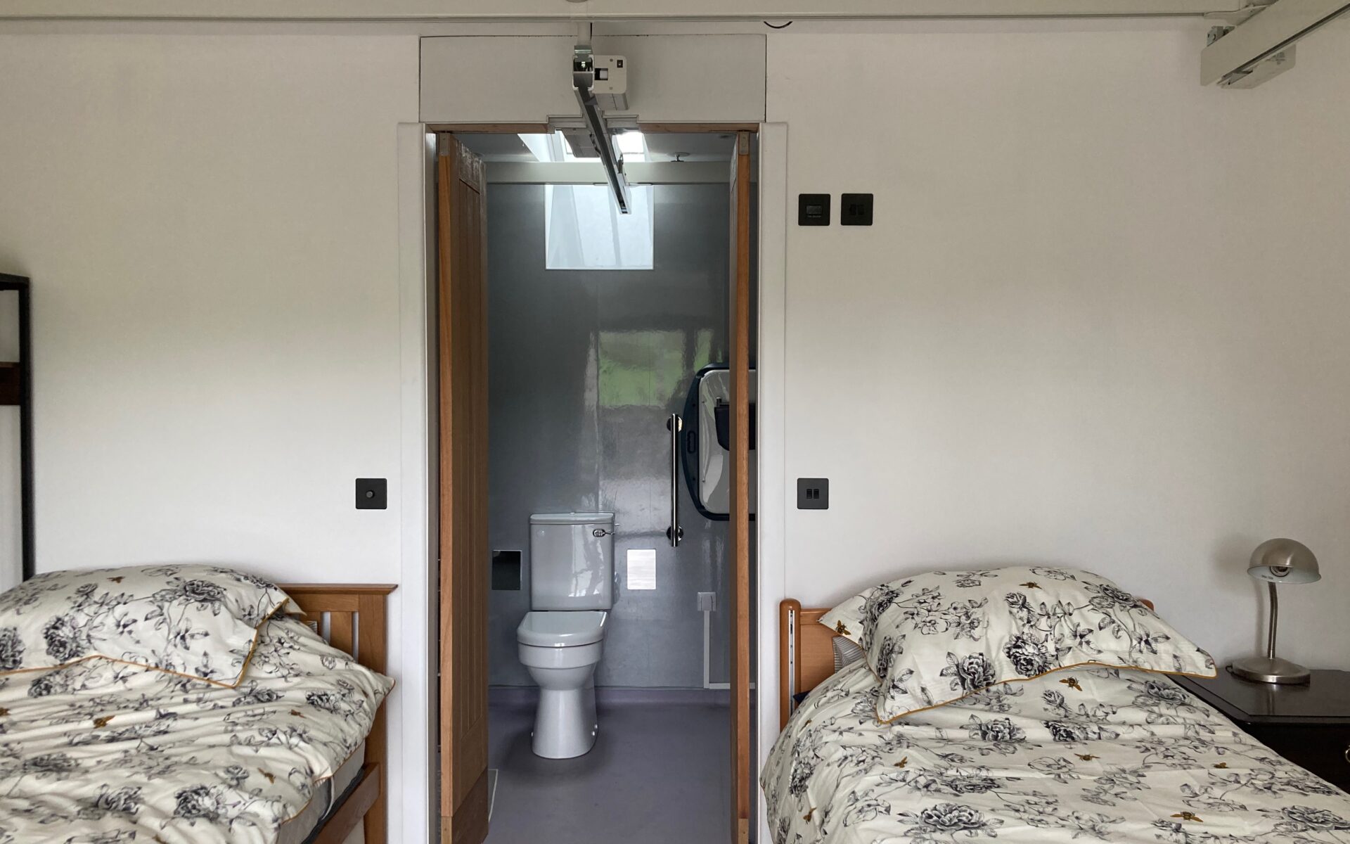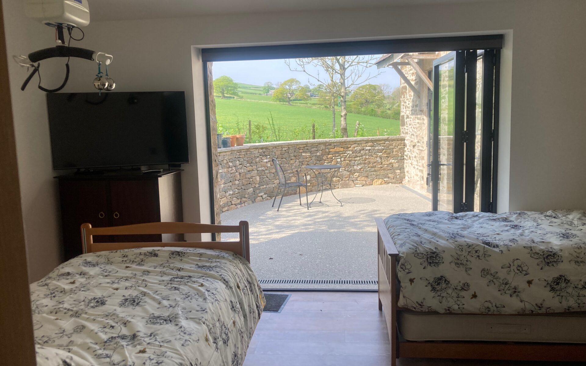 Bedroom One contains one single profiling bed with cot sides, a regular bed, electric tracking hoist from the bed to wet room, an H frame covering the bedroom area, storage space, and a smart tv. The trifold doors open out onto hard standing, shaded sensory garden.