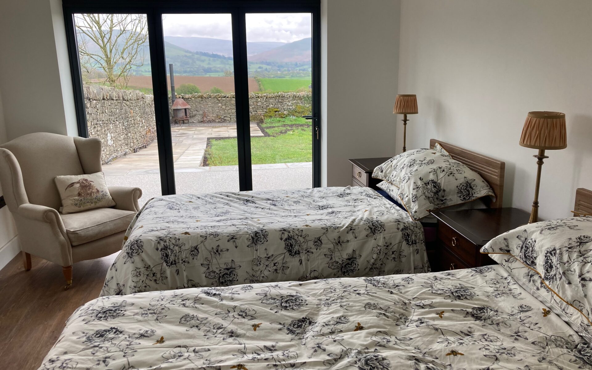 Bedroom Two contains two single profiling beds, which can be configured as a super king. The trifold doors open out onto patio area.