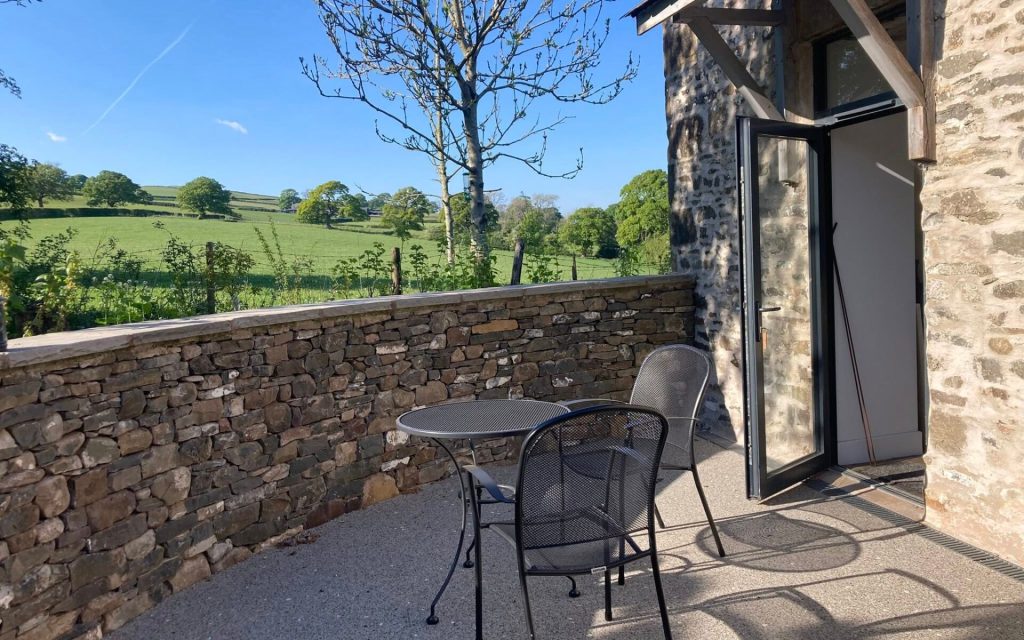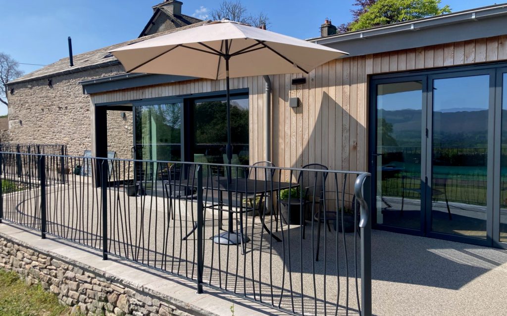 Patio doors from Bedroom One open onto the Sensory Garden, containing a second outdoor dining furniture set. The resin flooring has glow-in-the-dark stones scattered throughout, that can be enjoyed at night.