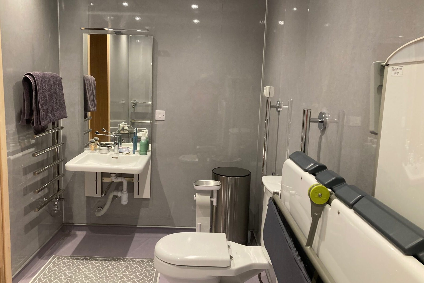Attached to Bedroom One is the Wet Room, with an electric shower, adjustable height dropdown shower bench, WC with grabrails and bidet, variable height wash basin, and heated towel rail.